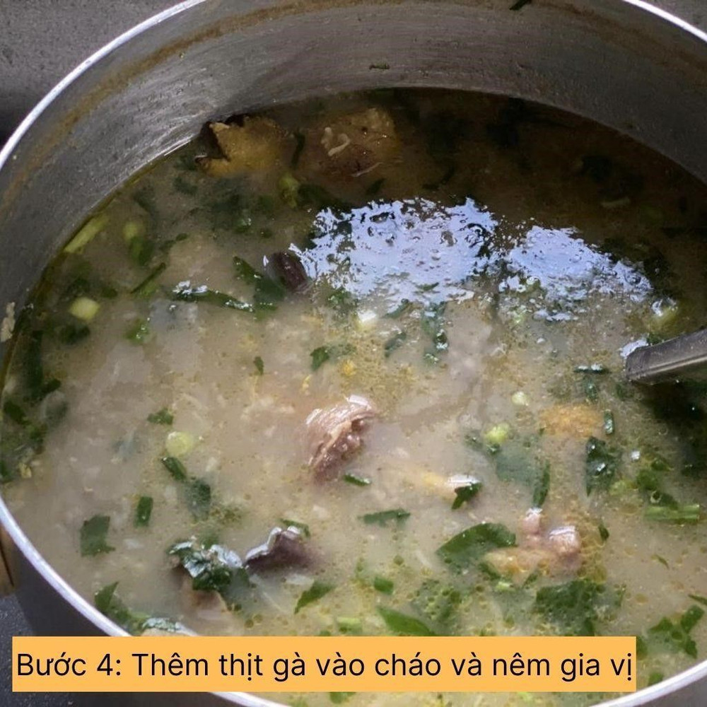 Nêm nước mắm, tiêu, hành lá, ngò rí vào cháo. Cuối cùng, cho thịt gà vào, đảo đều và tắt bếp.