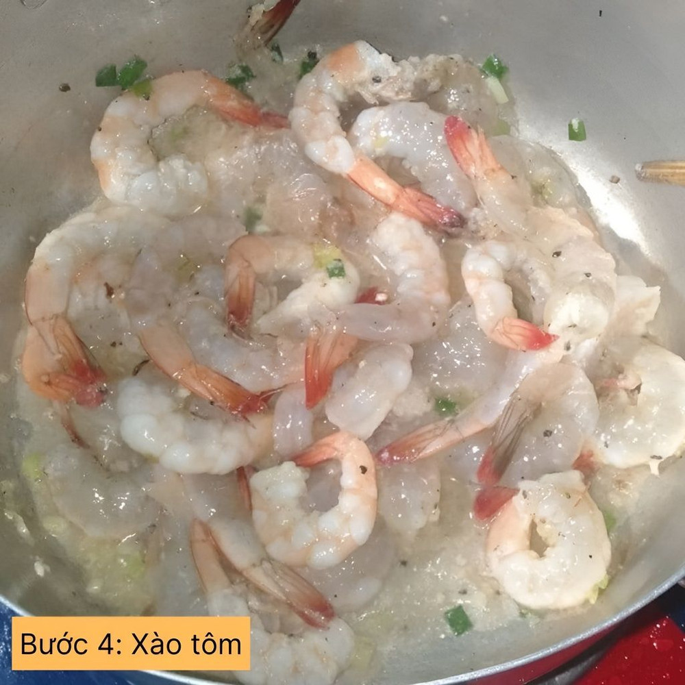 Phi thơm hành lá với dầu ăn, cho tôm vào xào chín, thêm nước mắm, hạt nêm, và tiêu rồi trộn đều.