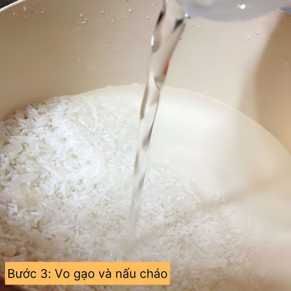 Vo sạch và nấu gạo tẻ trong khoảng 1 lít nước. Sau đó hạ nhỏ lửa, nấu đến khi gạo nở nhừ. Thêm gừng và muối vào cháo.