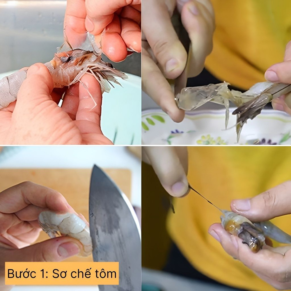 Rửa sạch tôm, bóc vỏ và dùng dao rút lấy phần chỉ đen.