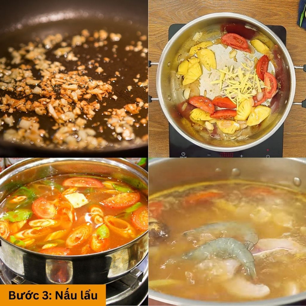 Nước sôi cho từ từ hải sản và rau vào nồi. Ăn kèm với bún, mì và chấm với nước mắm chanh ớt.