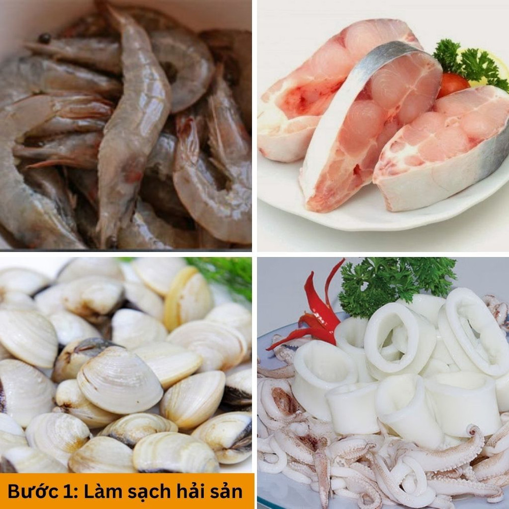 Tôm cắt bỏ râu, mực và cá cắt miếng vừa ăn, nghêu rửa sạch.