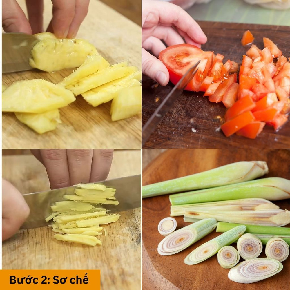 Thơm, cà chua cắt thành từng miếng vừa ăn. Tỏi băm nhuyễn, gừng cạo vỏ rồi cắt sợi, sả cắt lát. Rửa sạch các loại rau, nấm cắt khúc vừa ăn rồi để ráo nước.