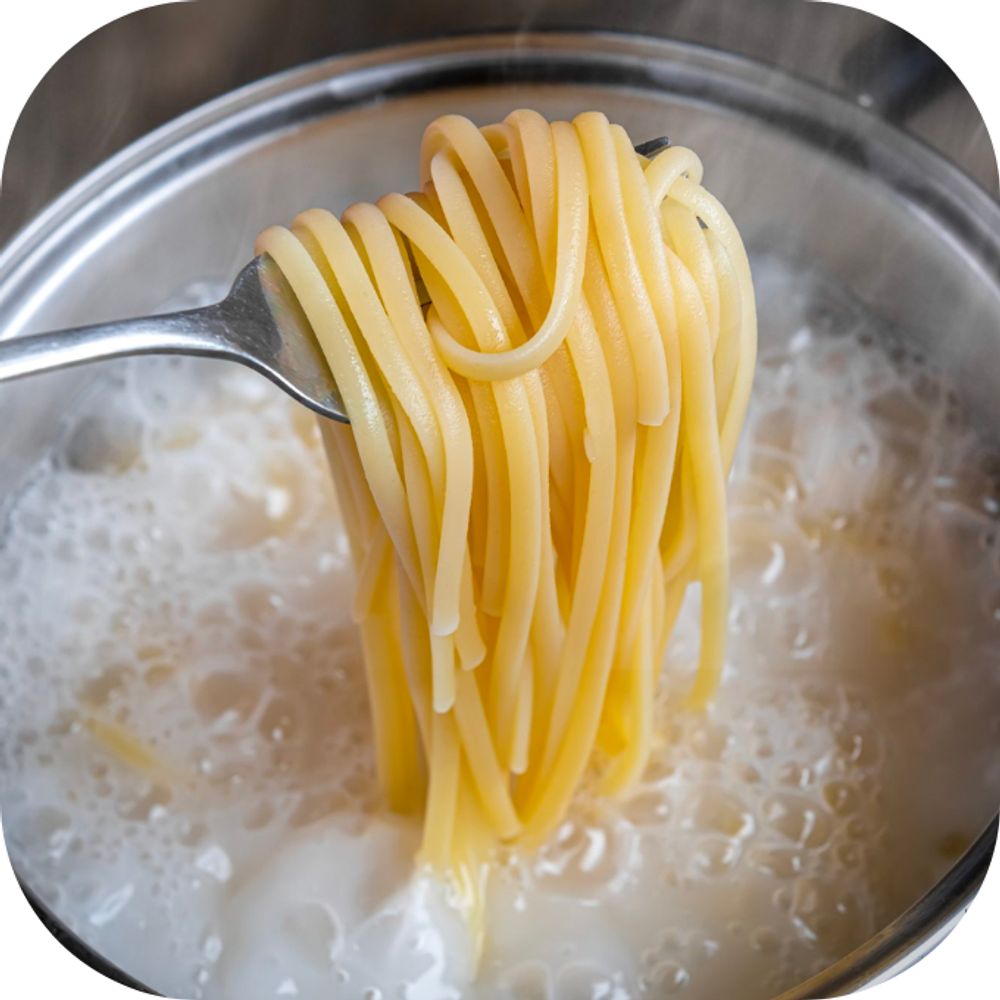 Bắt đầu bằng việc đun sôi nước mì Ý theo hướng dẫn trên bao bì. Khi mì đã hấp hơi, hớt ngay ra và để riêng.