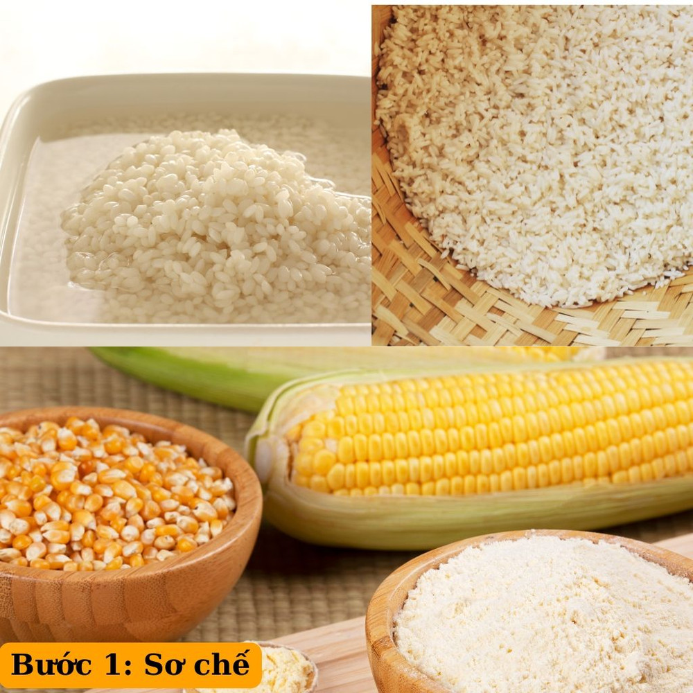 Ngâm gạo nếp trong nước để gạo mềm, rửa sạch và để ráo.Bắp tách hạt và rửa sạch