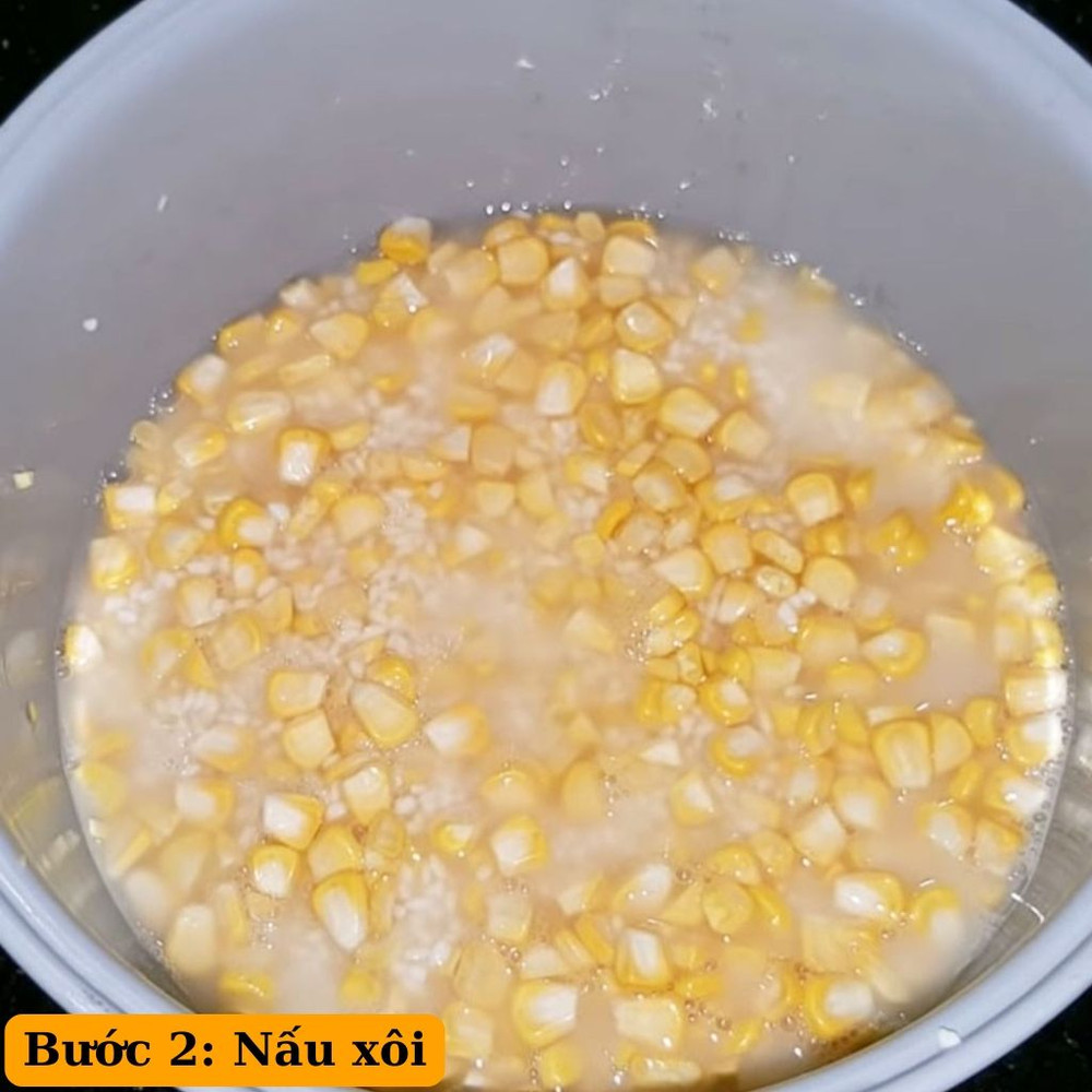 Cho gạo nếp và bắp vào nồi cơm điện, thêm nước vừa đủ ngập xâm xấp bề mặt. Thêm muối và nước cốt dừa, trộn đều và bắt đầu nấu
