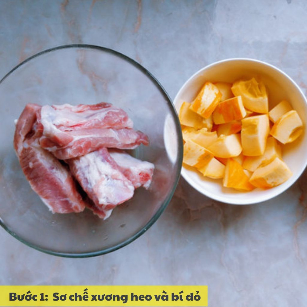 Xương heo rửa sạch, chần qua nước sôi để loại bỏ bọt và tạp chất. Sau đó, rửa lại với nước lạnh và để ráo. Bí đỏ gọt vỏ, bỏ hạt, rửa sạch và cắt miếng vừa ăn.