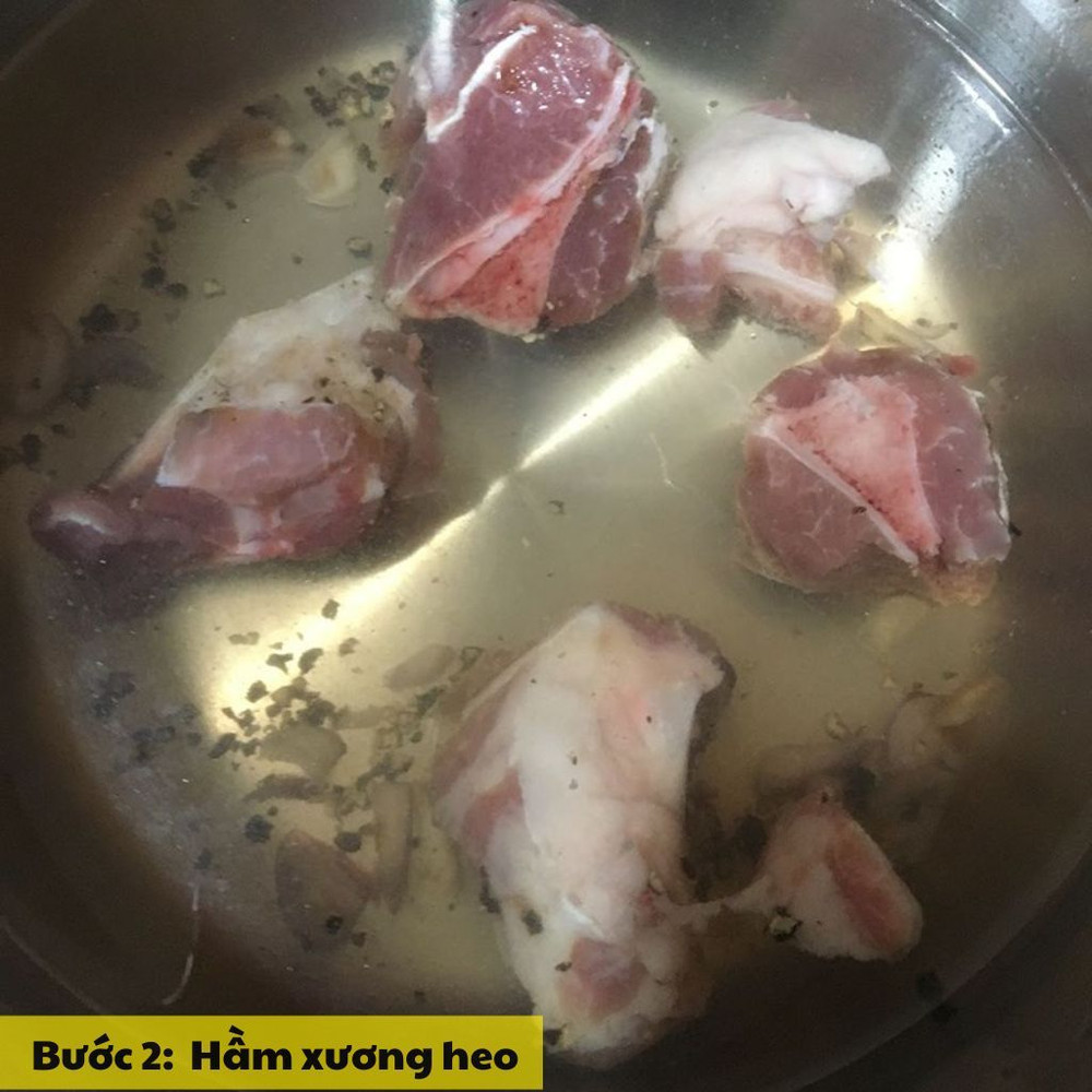 Đun nóng chảo với dầu ăn, phi thơm hành tím và tỏi băm, sau đó cho xương heo vào xào sơ khoảng 3-5 phút. Thêm nước dùng vào nồi, đun sôi, hạ lửa nhỏ và hầm xương trong khoảng 30 phút để xương ra nước ngọt.