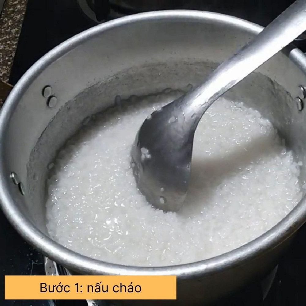 Đun sôi nước trong nồi, cho gạo vào nấu ở lửa nhỏ khoảng 40 phút cho đến khi gạo nở mềm.