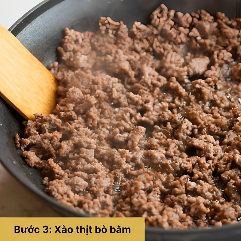 Sơ chế hành tây, tỏi thành những phần nhỏ vừa ăn. Phi thơm tỏi, hành tây, xào thịt bò bằm.