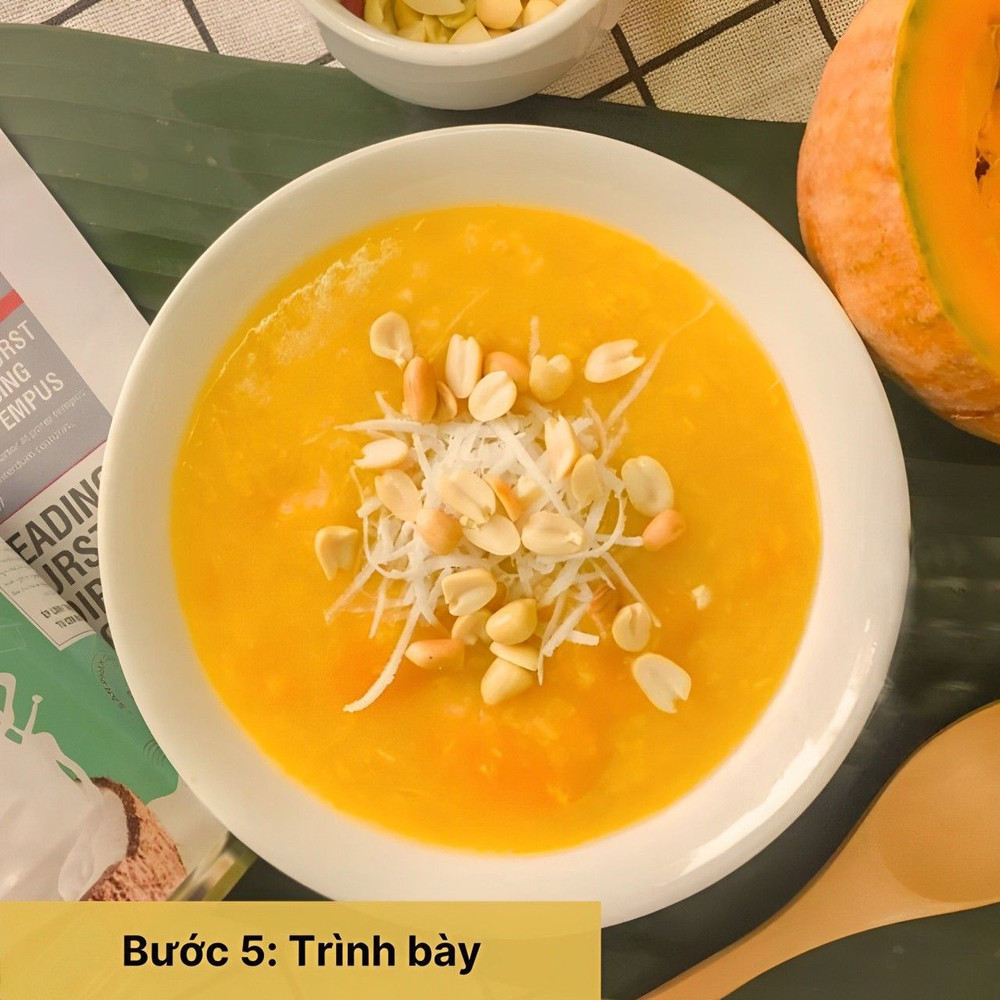 Cho đậu xanh đã ngâm, bí đỏ cắt hạt lựu, lá dứa vào nồi, đổ nước ngập. Nấu sôi, hạ nhỏ lửa hầm cho đến khi mềm. Thêm đường, muối vào và khuấy đều.