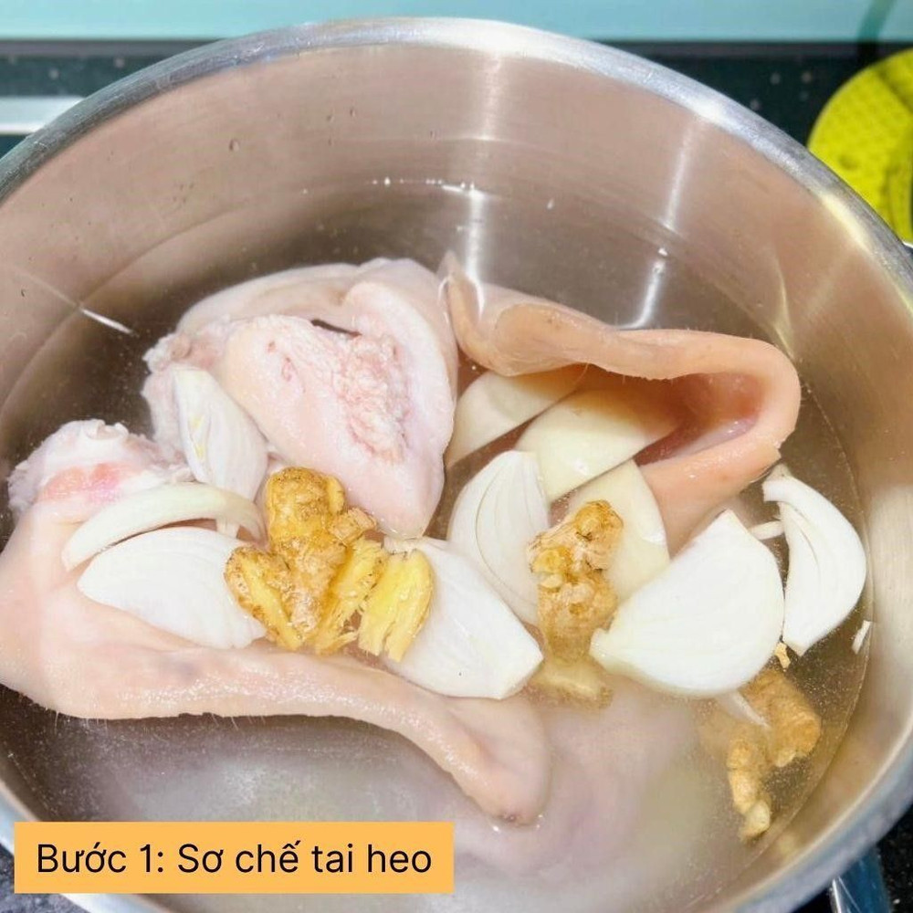 Tai heo rửa sạch, chà muối và gừng để khử mùi hôi. Rửa lại bằng nước sạch, sau đó luộc tai heo với vài lát gừng trong khoảng 20 phút cho tai heo chín tới. Khi chín, vớt tai heo ra, ngâm ngay vào nước đá để giữ độ giòn.