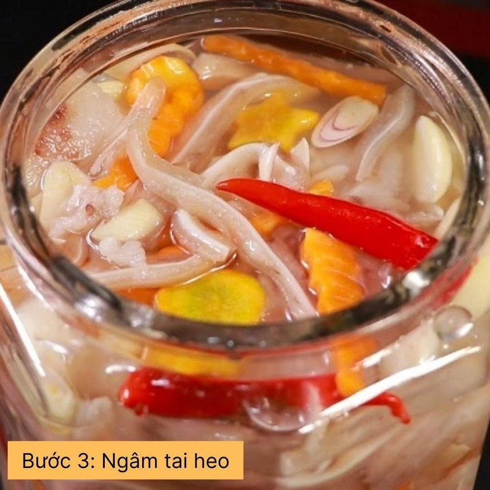Thái tai heo, cà rốt thành lát mỏng, tỏi, hành tím, ớt cho vào hũ thủy tinh. Đổ hỗn hợp nước giấm đã pha vào sao cho ngập tai heo. Đậy kín nắp và để ở nhiệt độ phòng trong khoảng 1 ngày, sau đó chuyển vào ngăn mát tủ lạnh để bảo quản.