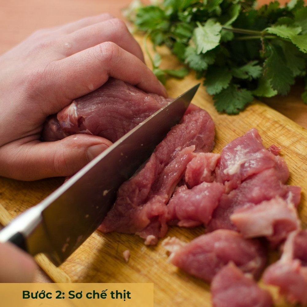 Sơ chế thịt và thái miếng vừa ăn. Sau đó ướp thịt với tỏi, hành tím băm, nước mắm, đường, tiêu trong 20 phút để thịt ngấm gia vị.