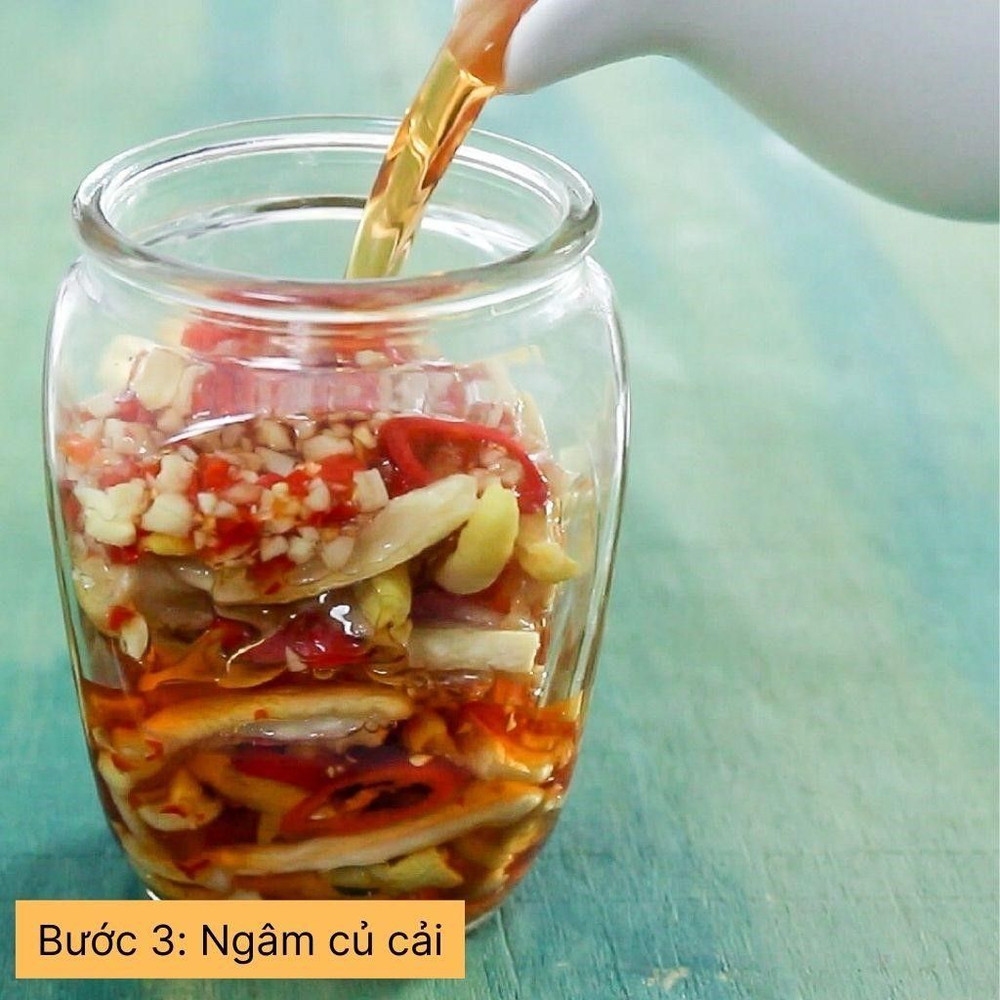 Cho tỏi và ớt vào hũ, xếp lớp củ cải. Đổ hỗn hợp nước mắm đã nguội vào hũ sao cho ngập củ cải và cà rốt. Đậy kín nắp và để hũ ở nhiệt độ phòng khoảng 1-2 ngày, sau đó bảo quản trong ngăn mát tủ lạnh. Món củ cải ngâm nước mắm sẽ ngon hơn sau 1 ngày ngâm.