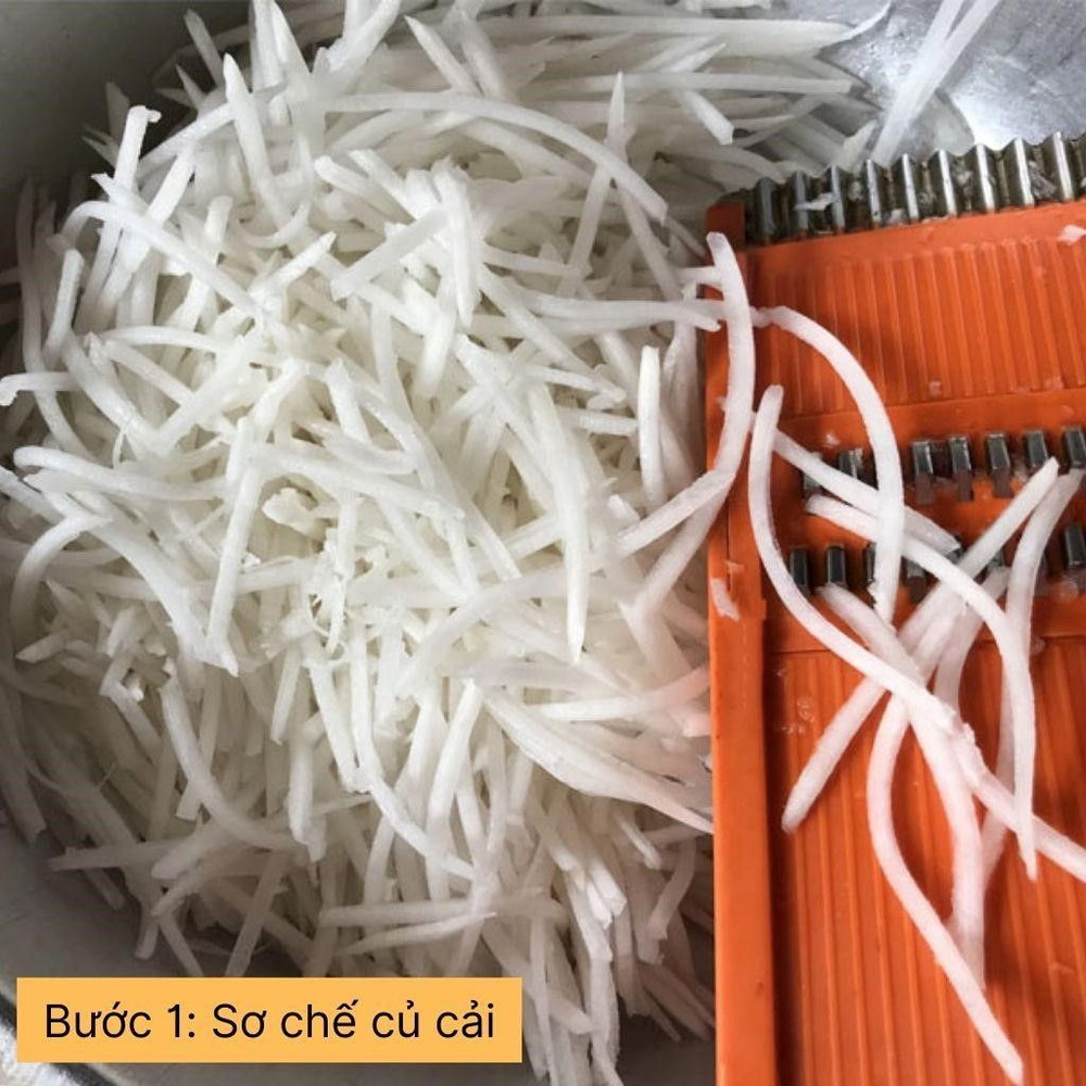 Củ cải rửa sạch, gọt vỏ, sau đó thái sợi hoặc lát mỏng. Ngâm củ cải trong nước muối loãng khoảng 15 phút, rồi xả sạch, để ráo.