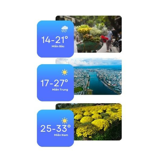 - Miền Trung: Thời tiết có sự phân hóa. Khu vực Bắc Trung Bộ se lạnh, có mưa rào rải rác. Càng vào phía Nam Trung Bộ trời càng ấm dần, nắng nhẹ, rất thích hợp cho du lịch biển.