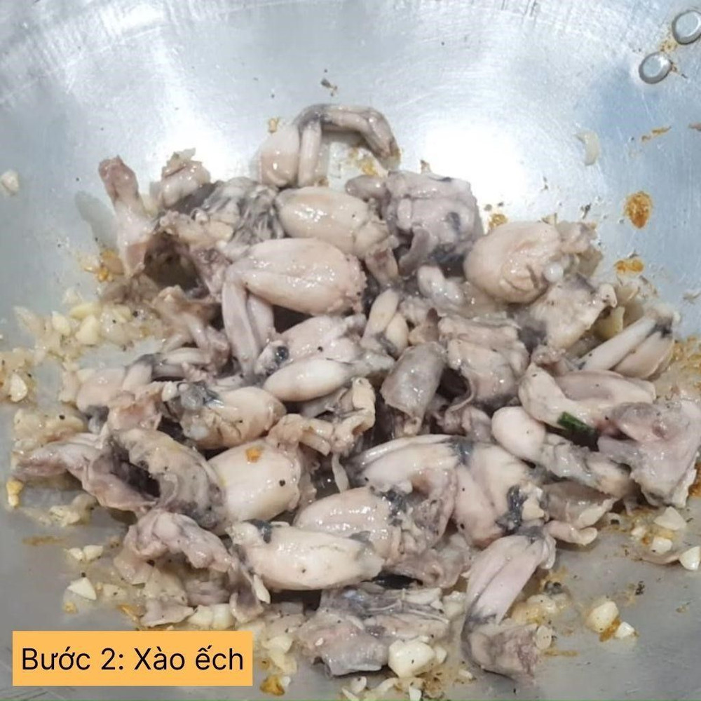 Bắc chảo lên bếp, cho dầu ăn và tỏi băm vào phi thơm. Thêm thịt ếch vào xào trên lửa vừa cho đến khi thịt săn lại và chín vàng đều.