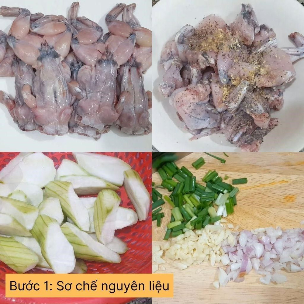 Thịt ếch rửa sạch, chặt miếng vừa ăn. Ướp thịt ếch với 1/2 muỗng cà phê hạt nêm và một ít tiêu trong 10 phút. Mướp gọt vỏ, rửa sạch, cắt lát vừa ăn. Hành lá rửa sạch, thái nhỏ.