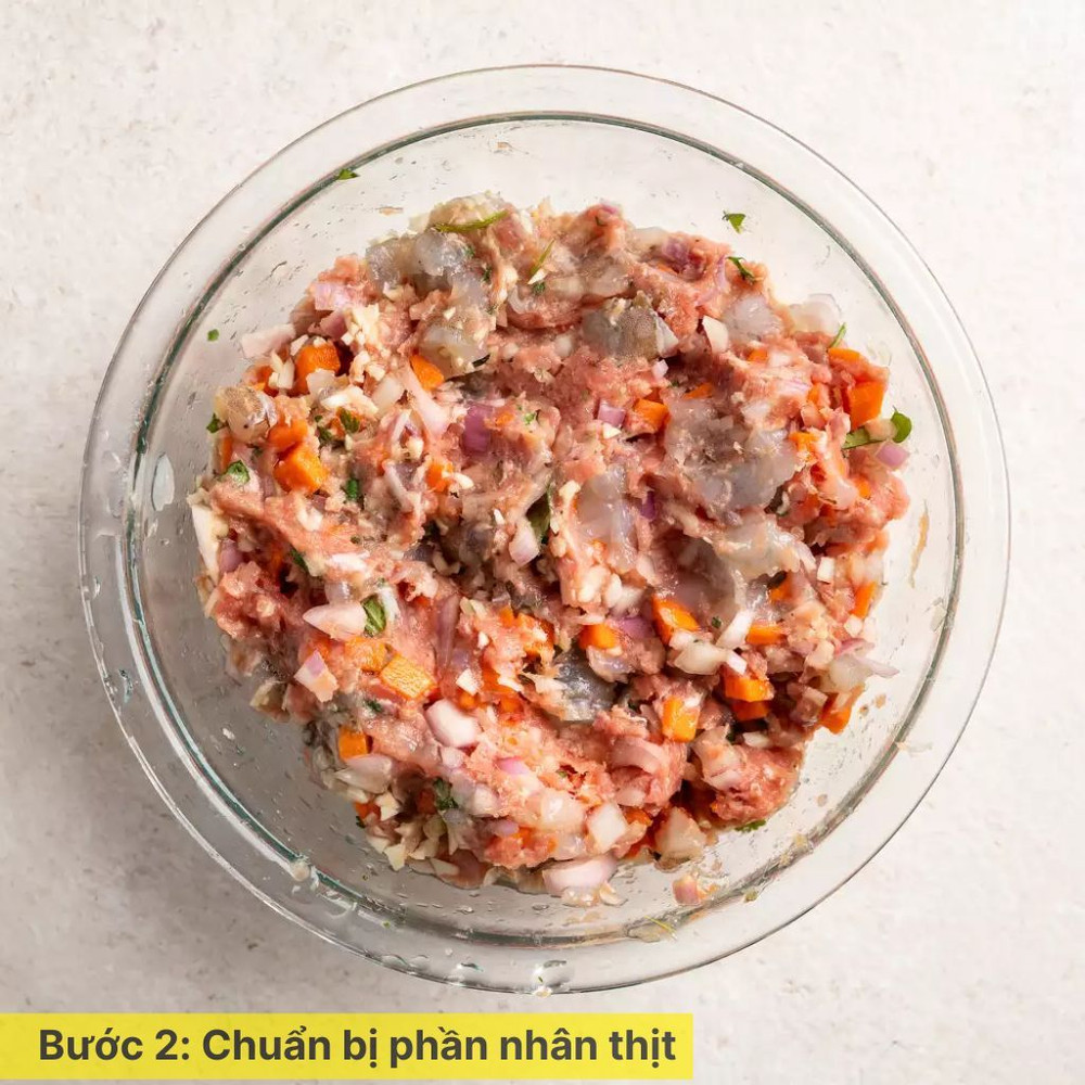 Ngâm nấm mèo và băm nhỏ. Cà rốt gọt vỏ, rửa sạch, băm nhuyễn. Trộn đều thịt heo băm, nấm mèo, cà rốt, hành tím băm, tỏi băm, thêm muối, hạt nêm, tiêu và nước mắm. Trộn đều hỗn hợp để gia vị thấm vào nhân thịt.