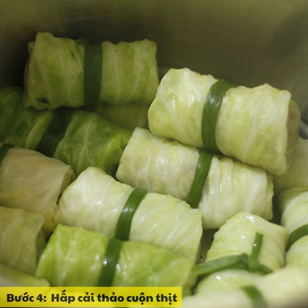 Xếp các cuộn cải thảo vào xửng hấp, hấp khoảng 15-20 phút đến khi thịt bên trong chín đều. Kiểm tra cuộn cải thảo, nếu nhân thịt không còn màu hồng là món đã chín.