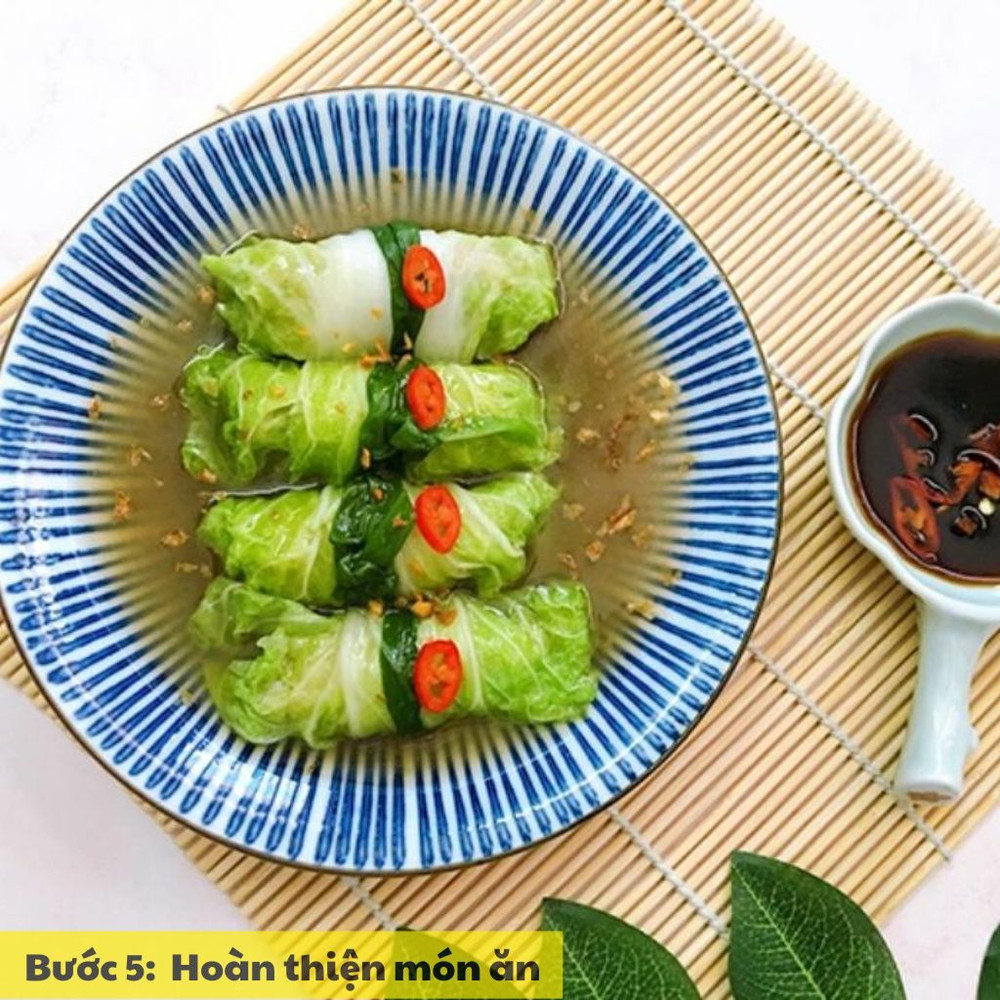 Bày cuộn cải thảo ra đĩa, có thể chấm kèm nước mắm pha chua ngọt hoặc nước tương để tăng hương vị. Món ăn thanh đạm này rất hợp dùng trong các bữa cơm gia đình.