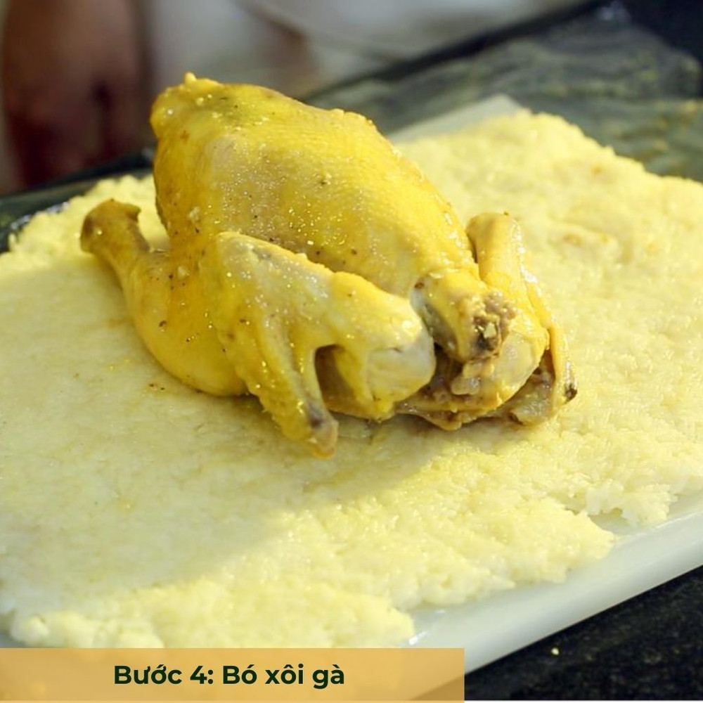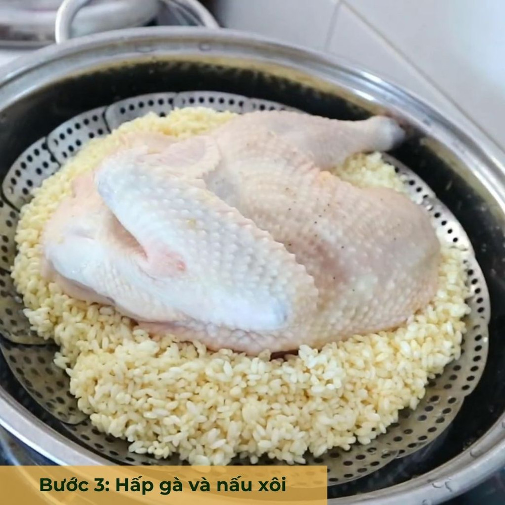 Hấp gà đến khi chín mềm (khoảng 30-40 phút). Đồng thời, nấu xôi từ gạo nếp và đậu xanh, có thể thêm một ít muối vào xôi để tăng vị đậm đà.