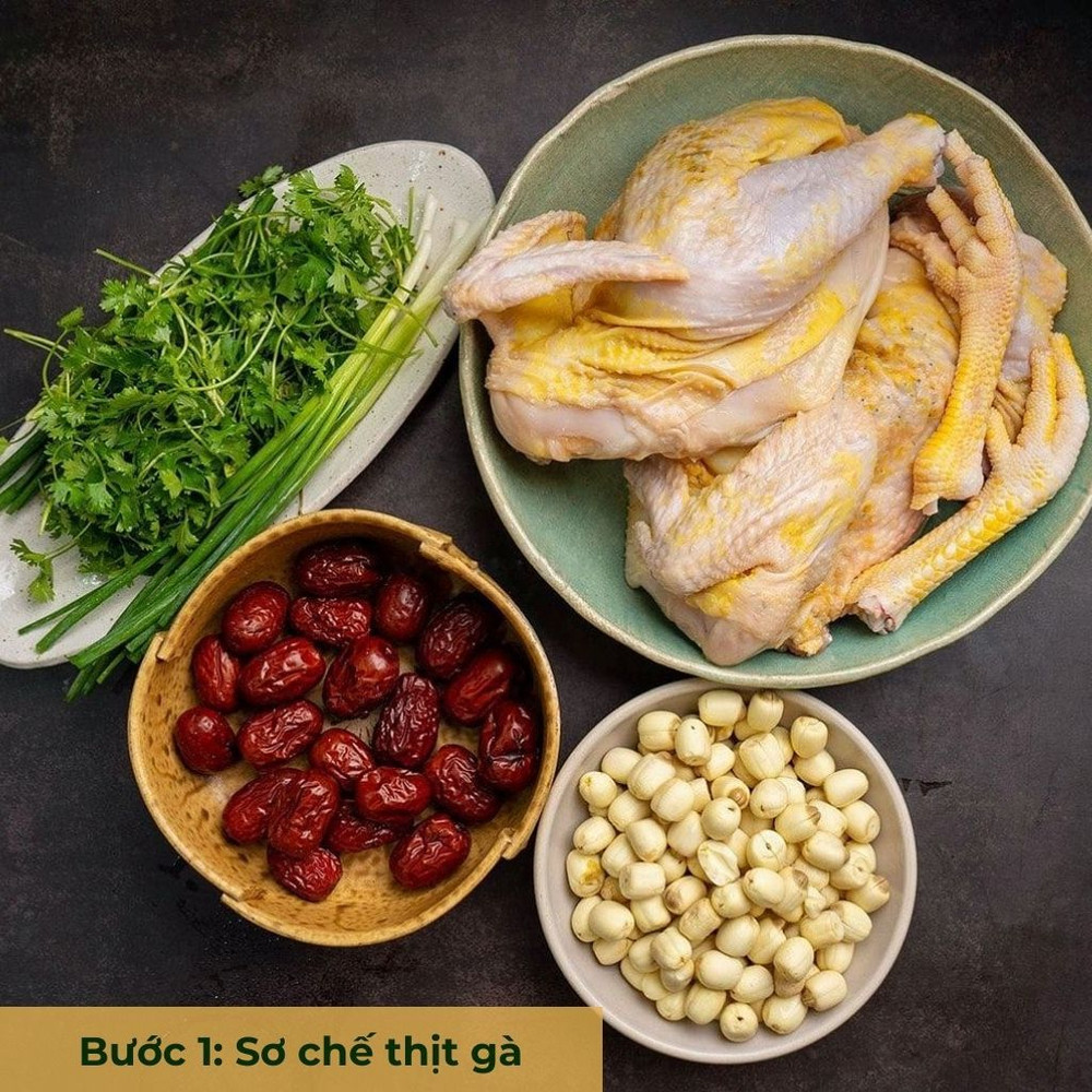 Gà rửa sạch và cắt miếng vừa ăn. Rửa sạch hạt sen, nếu dùng hạt sen khô cần ngâm trước khoảng 1-2 tiếng. Nấm hương ngâm mềm, rửa sạch. Cà rốt gọt vỏ, cắt khúc vừa ăn.