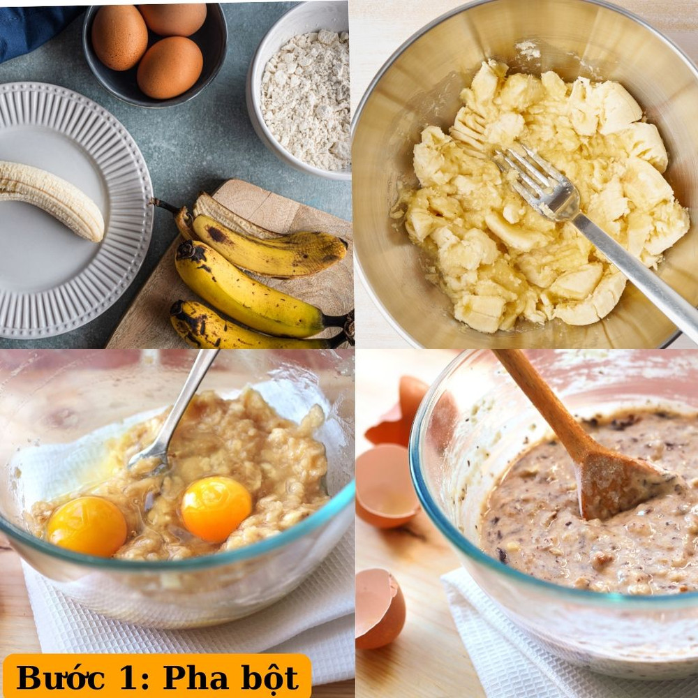 Cho chuối vào tô và nghiền nhuyễn, sau đó cho trứng, sữa tươi và vani vào khuấy đều. Thêm yến mạch, bột nở, và một ít muối vào hỗn hợp, trộn đều cho đến khi hòa quyện.