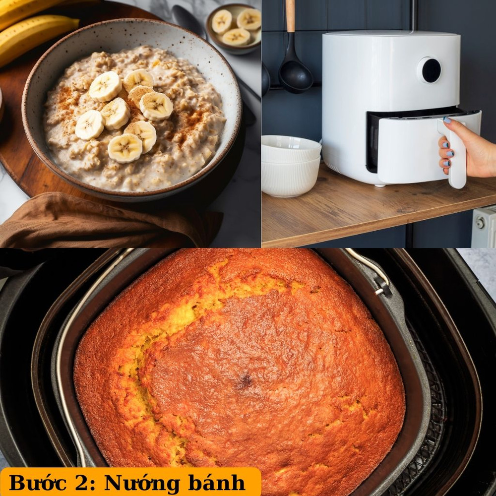 Làm nóng nồi chiên trước ở nhiệt độ 180°C. Đổ hỗn hợp vào khuôn nướng và san đều bề mặt. Nướng bánh trong 25-30 phút cho đến khi bánh chín vàng và thơm.