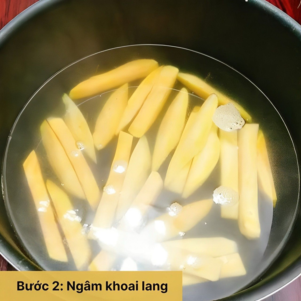 Ngâm khoai vào nước muối loãng khoảng 15 phút để khoai ra bớt nhựa và không bị thâm, sau đó vớt khoai ra, để ráo.
