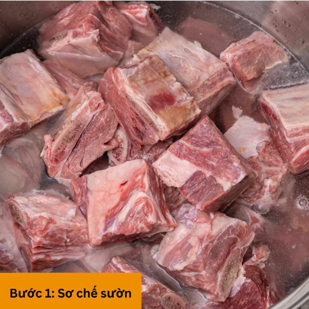 Rửa sạch sườn với nước muối loãng để khử mùi hôi, rửa lại với nước sạch rồi để ráo.