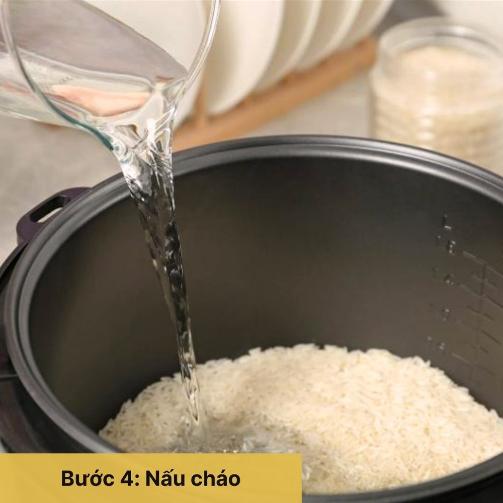 Cho gạo và nước vào nồi cơm điện, nấu trong khoảng 30 phút cho gạo nhừ. Nếu muốn cháo ngọt thanh hơn, có thể lấy nước hầm xương để nấu cháo.