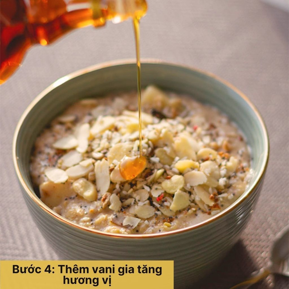 Sau khi cháo yến mạch chín, bạn thêm vani và rắc thêm các loại hạt, hoa quả khô lên trên để tăng thêm hương vị cho món ăn.