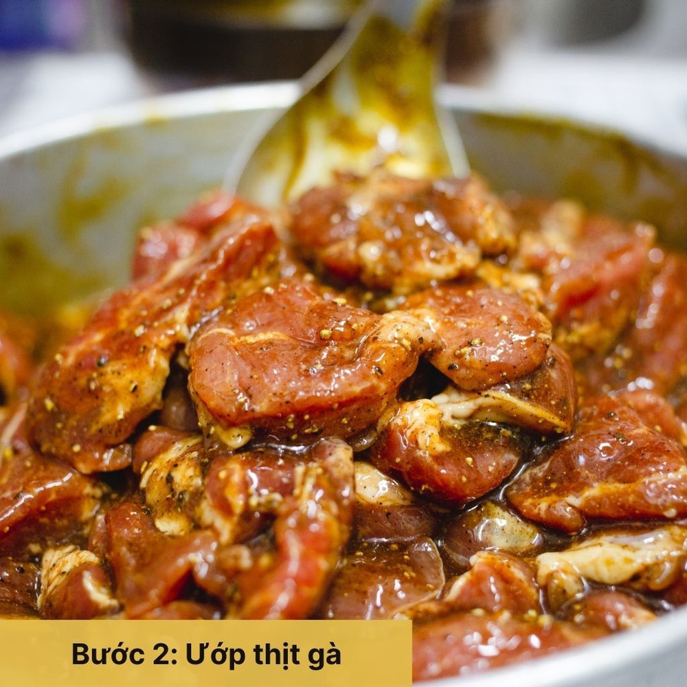 Ướp thịt gà với nước mắm, đường, tiêu, dầu hào để nghỉ trong khoảng 30 phút cho thịt gà ngấm gia vị. Nên làm cùng lúc với việc hầm xương để tiết kiệm thời gian.