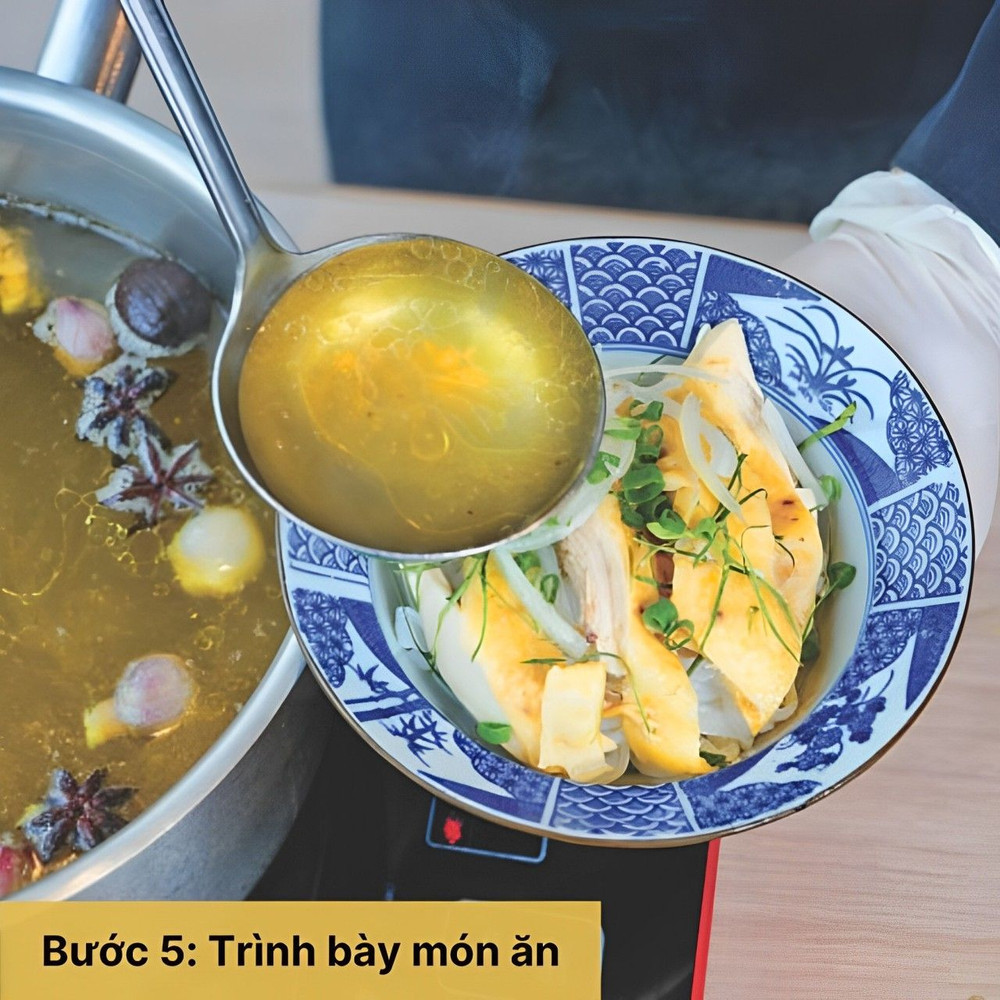 Múc phở ra tô, chan nước dùng, xếp thịt gà, rau thơm vào tô. Ăn kèm với giá, hành tây, chanh, ớt tùy theo sở thích mỗi người.