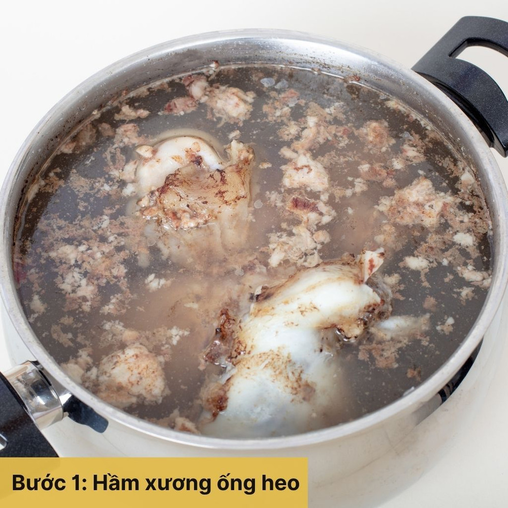 Rửa sạch xương ống heo rồi cho vào nồi hầm lấy nước dùng. Hầm xương trong khoảng 1 giờ đồng hồ, có thể hầm lâu hơn nước dùng sẽ càng ngọt nước.