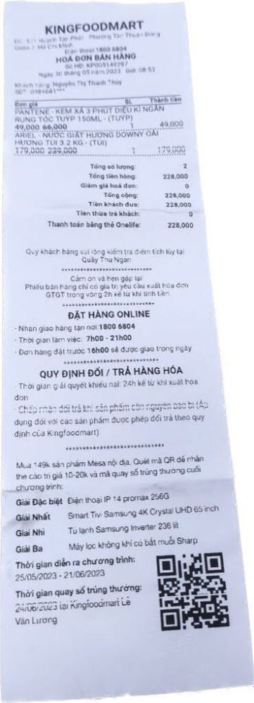 – Sau đó khách hàng mua sản phẩm khuyến mại trong thời gian khuyến mại và tìm mã QR (“QR code”) được in cuối hoá đơn mua hàng để xem số lượng mã dự thưởng của mình.