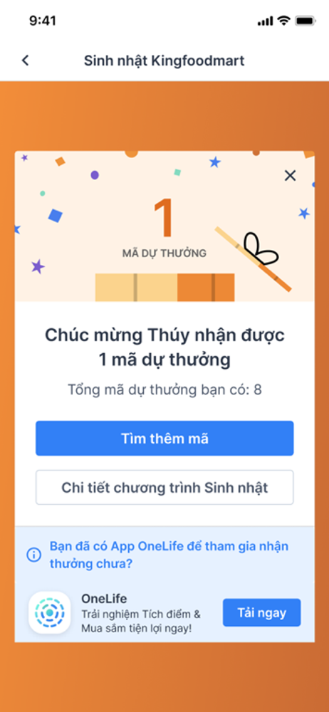 - Hệ thống sẽ gửi thông báo đến khách hàng trúng giải qua Ứng dụng OneLife, nội dung: Chúc mừng bạn đã trúng Giải Nhất/ Giải Nhì/ Giải Ba của chương trình Sinh nhật 5 năm – Cơ hội trúng ngay Iphone 14 Pro Max của Kingfoodmart. Quý khách vui lòng xem thể lệ nhận giải tại www.kingfoodmart.com hoặc liên hệ số 18006804.