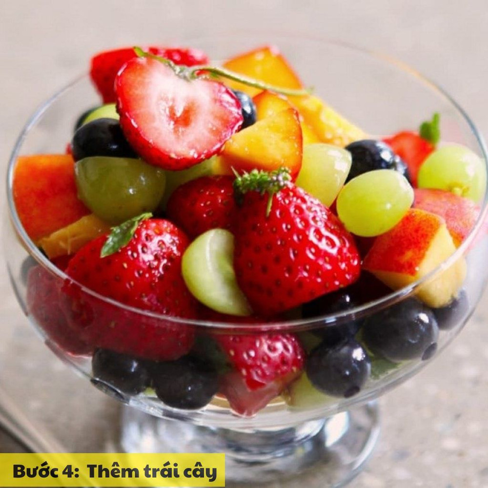 Cắt nhỏ trái cây tươi như dâu tây, việt quất, chuối, hoặc kiwi. Rải đều lên trên mặt sữa chua hạt chia để tăng thêm hương vị và giá trị dinh dưỡng.