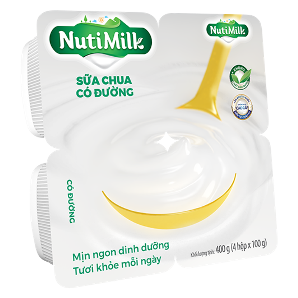 Sữa chua có đường Nutimilk được sản xuất bằng sữa bò tươi kết hợp cùng chủng men cao cấp từ châu Âu (lactobacillus bulgaricus, streptococcus thermophilus) cùng các loại vitamin A, vitamin B, vitamin D3, canxi,… giúp bé phát triển xương, tiêu hoá tốt, tăng sức đề kháng và được cung cấp đầy đủ dưỡng chất cho cơ thể.