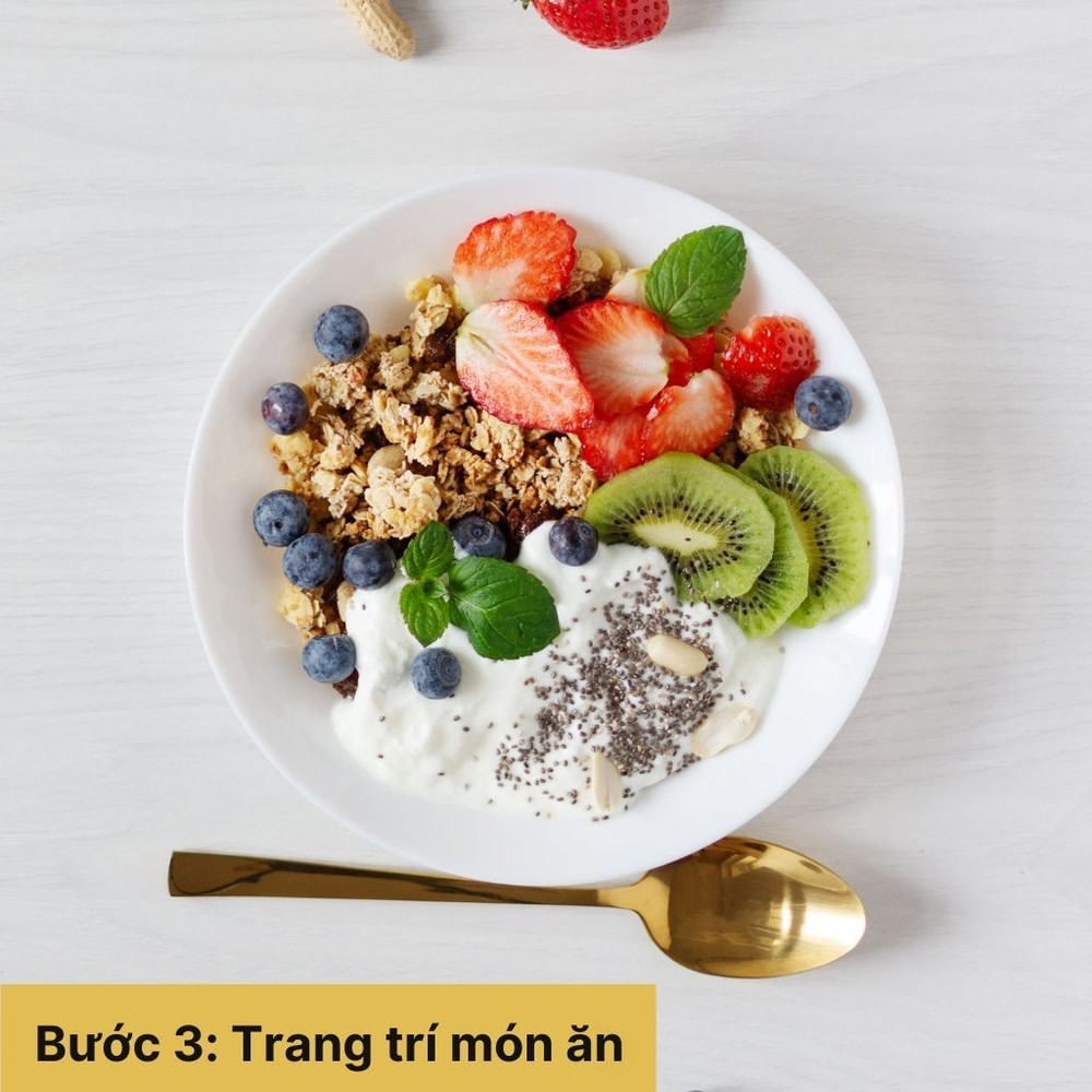 Cho lần lượt chuối, các loại hạt và trái cây tươi vào bát sữa chua yến mạch trang trí cho đẹp mắt.