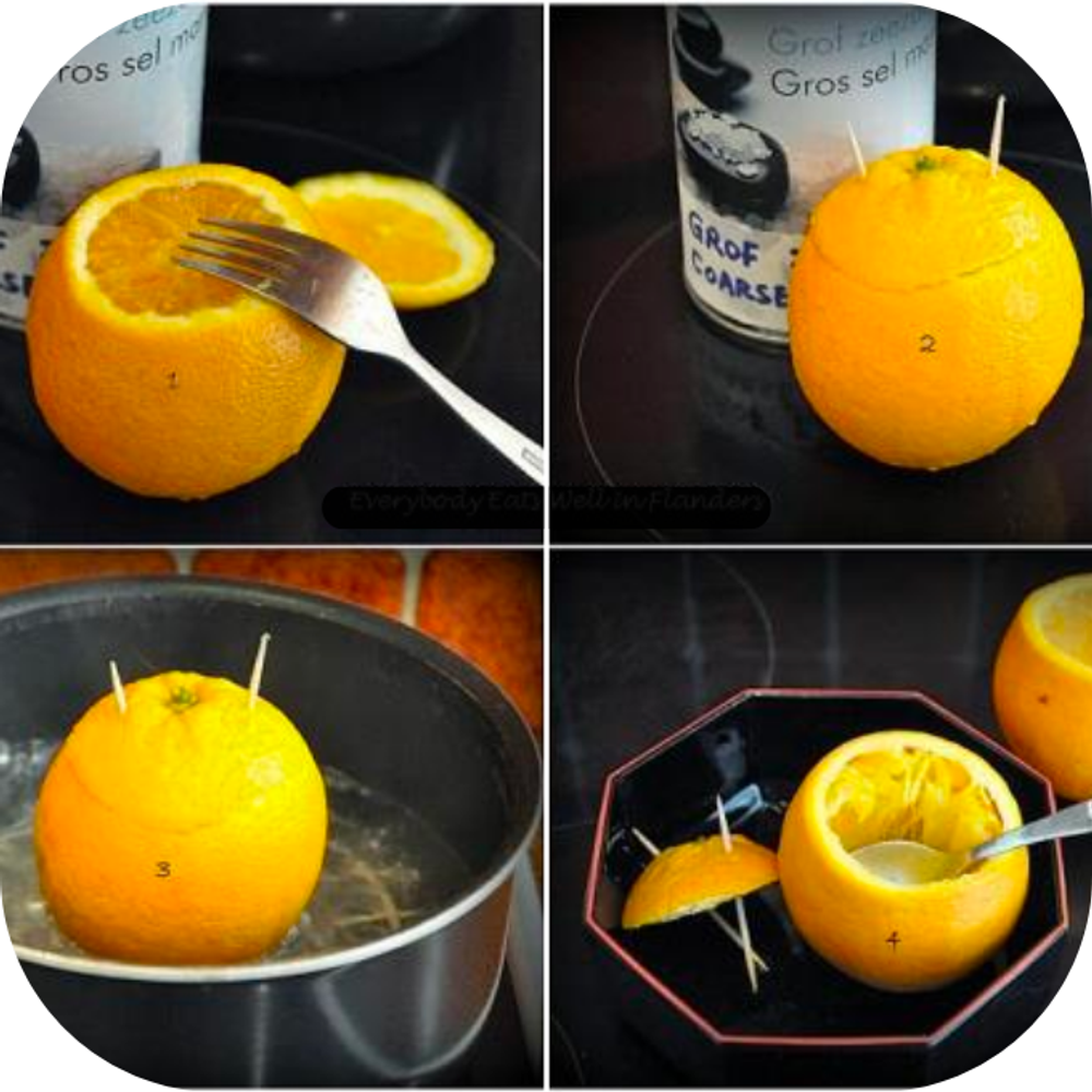 • Bước 2: Cắt phần trên của quả cam hoặc quýt, cho ½ hoặc 1 muỗng muối vào bên trong quả. Sử dụng nĩa hoặc tăm để cho muối thấm vào bên trong quả.